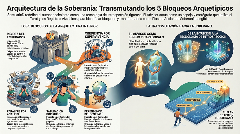 A continuación, revelamos los 5 bloqueos arquetípicos más frecuentes que detectamos en nuestros Exploradores (nuestros clientes) y cómo la intervención estratégica de un Advisor logra transmutarlos en pura Soberanía Interior.