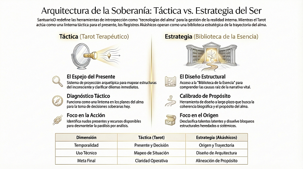 | Criterio de Decisión | Tarot Evolutivo / Terapéutico (La Linterna Táctica) | Registros Akáshicos (El Archivo Estructural) |