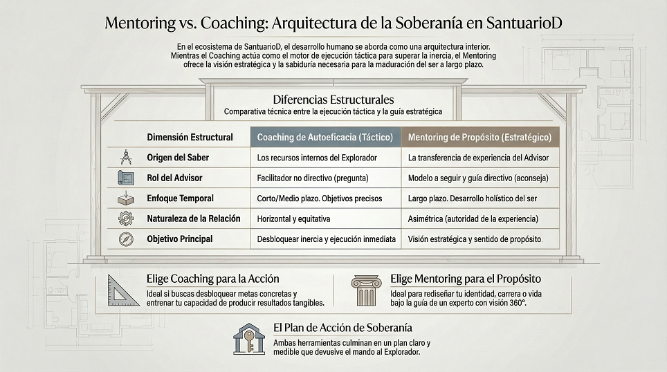 Para recuperar el mando de tu vida y alcanzar lo que denominamos la Soberanía Interior, es imperativo comprender que el Coaching y el Mentoring son tecnologías de intervención radicalmente distintas. Elegir la herramienta incorrecta es equivalente a usar un martillo para afinar un reloj: no solo es ineficaz, sino que puede agravar tu parálisis.